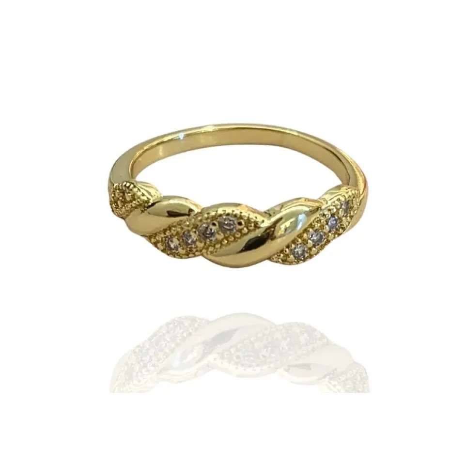 ANEL ENTRELAÇADO CRAVEJADO COM ZIRCÔNIAS CRISTAIS E LISO