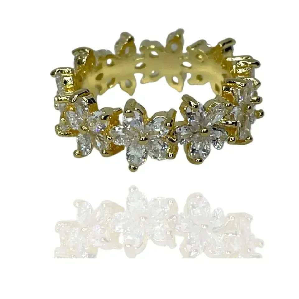 Anel com flores cravejadas com zircônias em gotas cristais