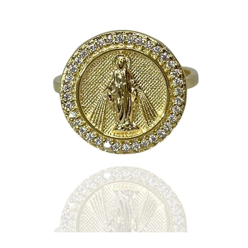 Anel mandala Nossa Senhora das Graças cravejado em volta com zircônias cristais