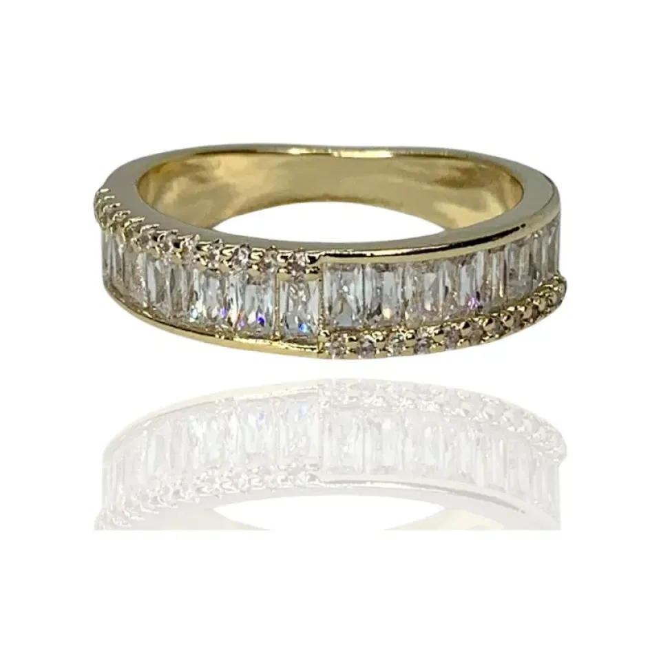 Anel meia aliança com baguetes e zircônias cristais
