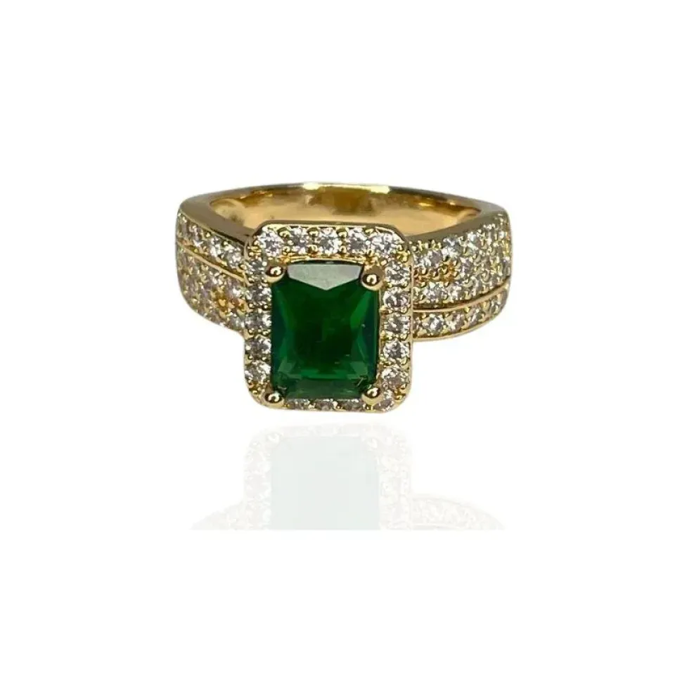 ANEL PRINCESA CRAVEJADO COM PEDRA RETANGULAR VERDE ESMERALDA
