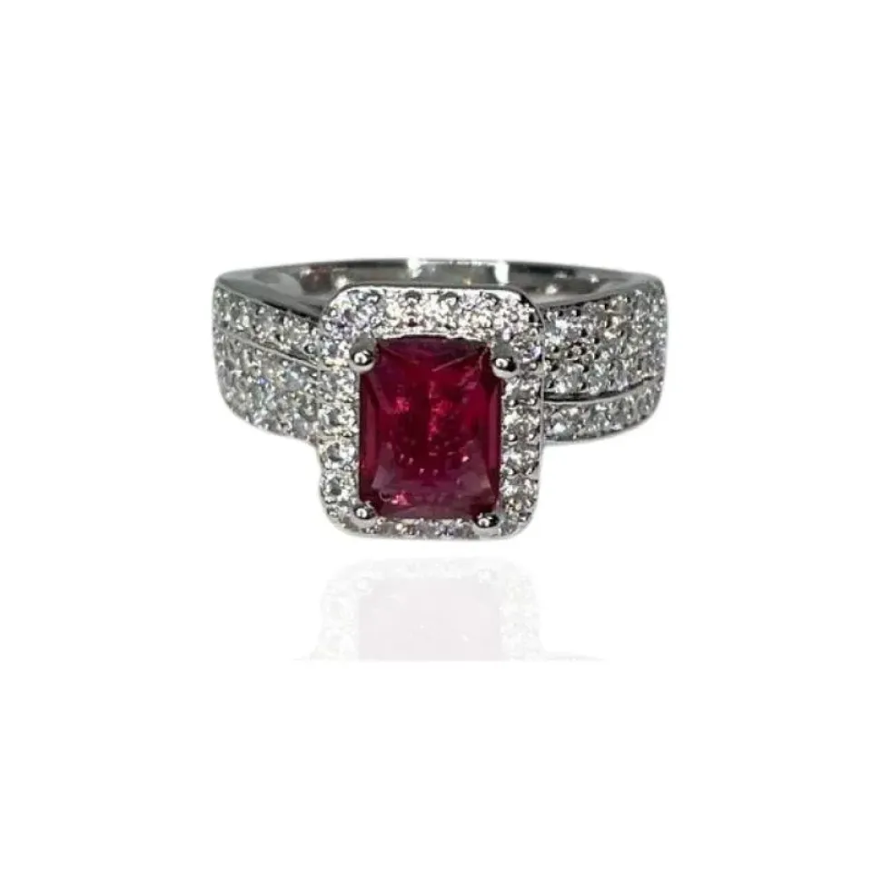 ANEL PRINCESA CRAVEJADO COM PEDRA RETANGULAR RUBI