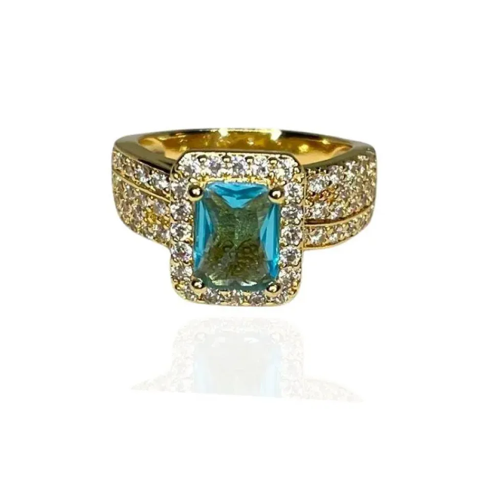 ANEL PRINCESA CRAVEJADO COM PEDRA RETANGULAR AQUA