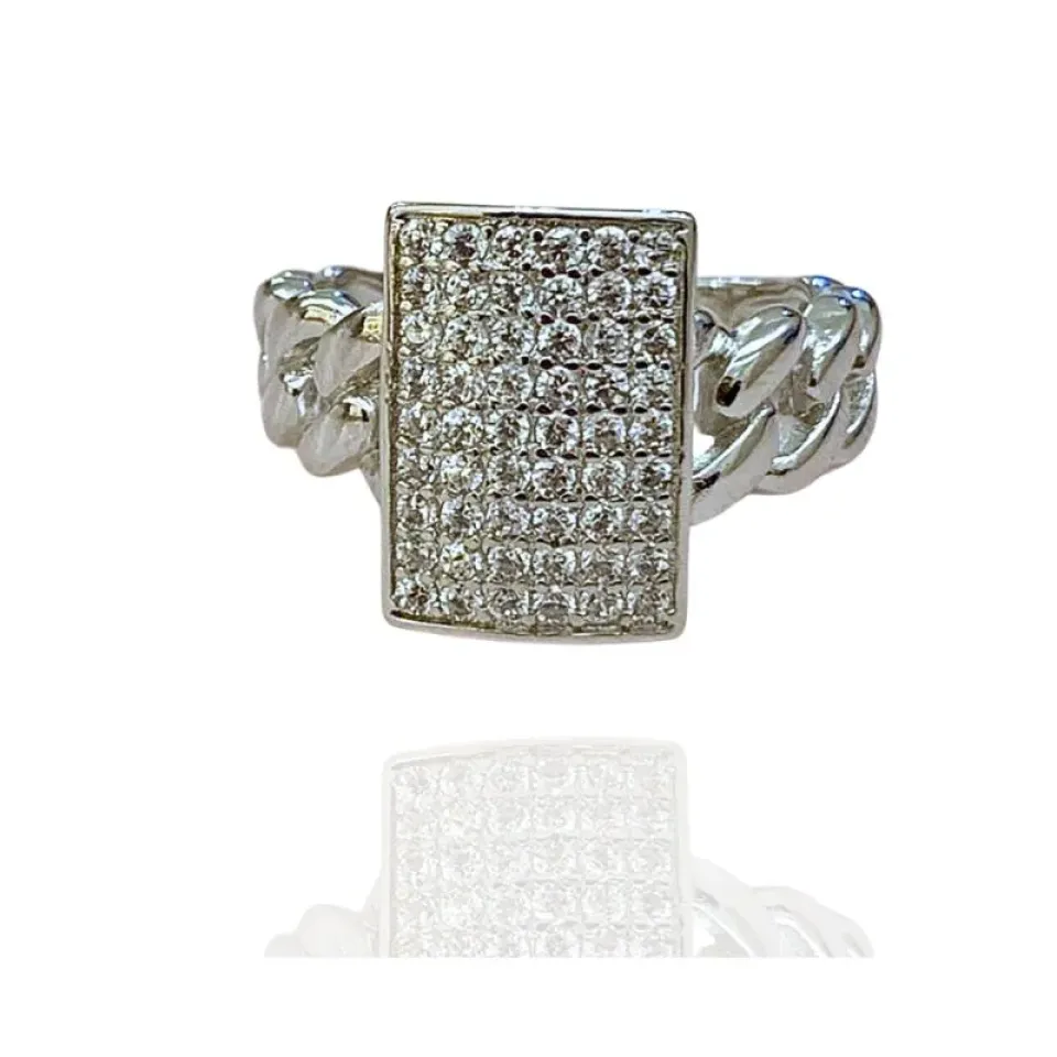 ANEL RETÂNGULO CRAVEJADO DE ZIRCÔNIAS CRISTAIS E ELOS DOS LADOS