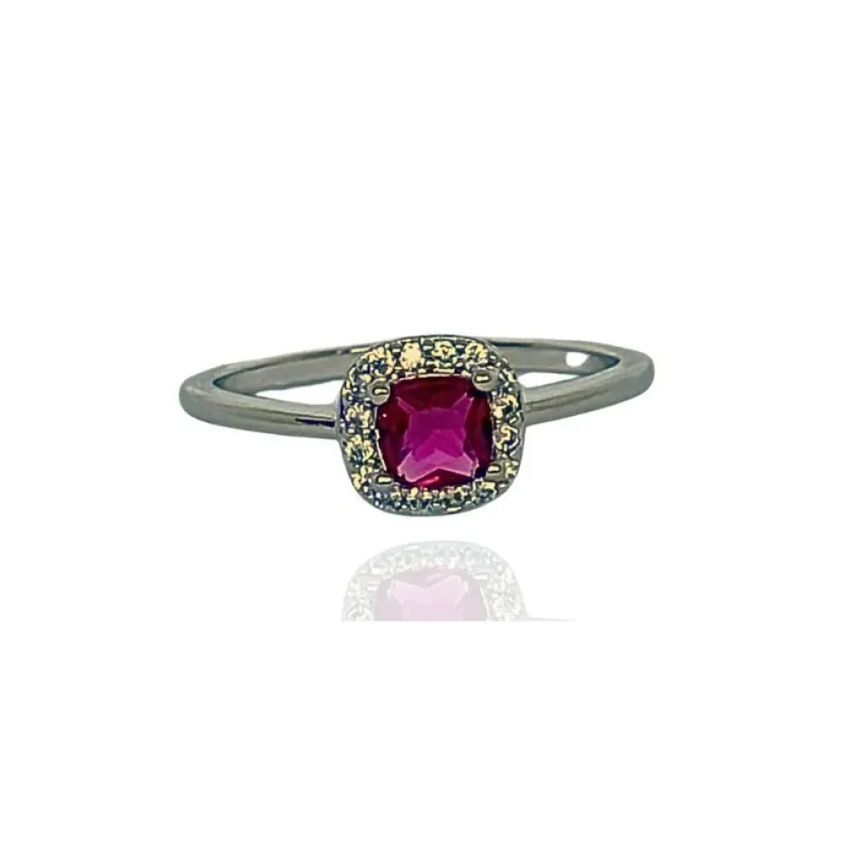 ANEL SOLITÁRIO QUADRADO CRAVEJADO EM VOLTA RUBI E CRISTAL