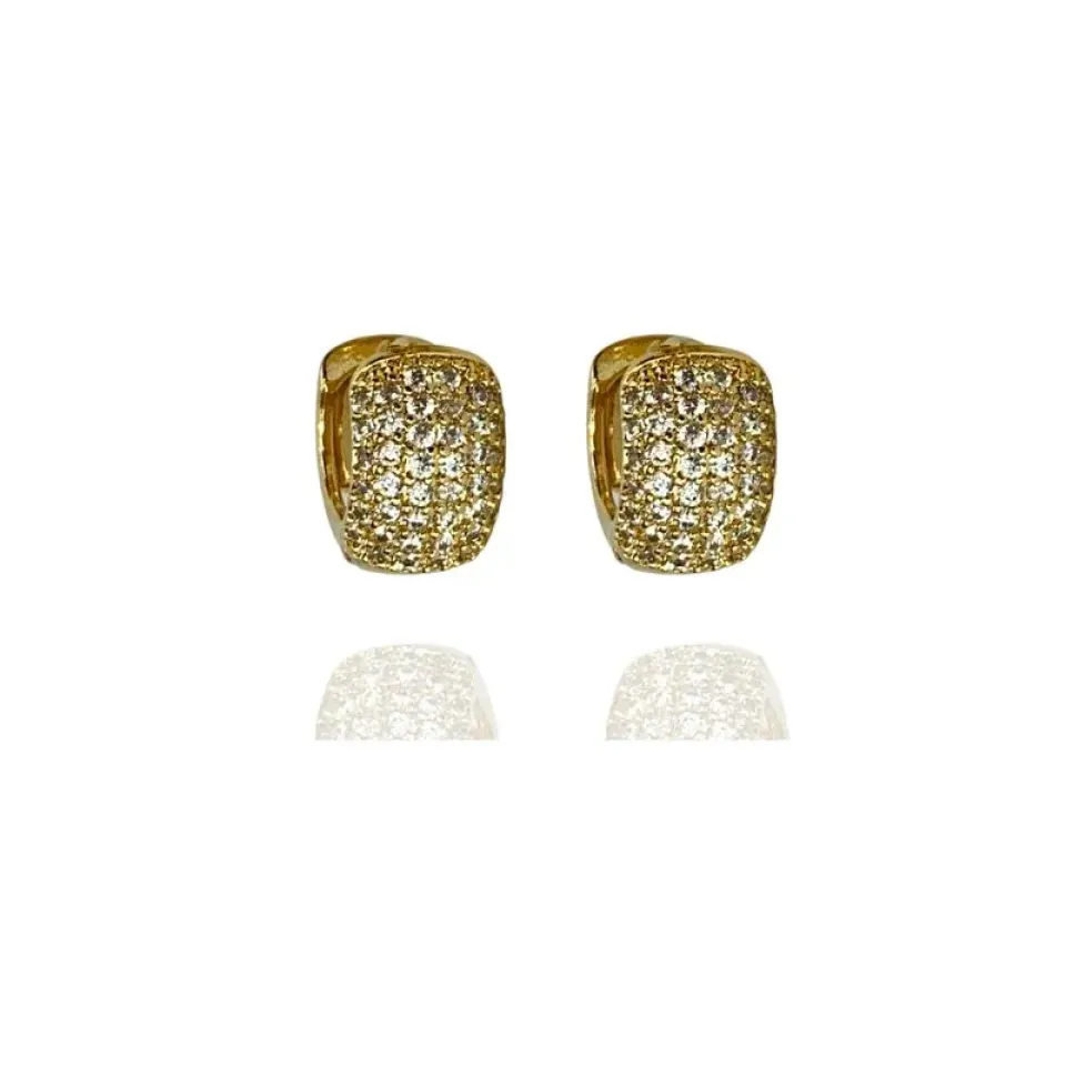 Argola média grossa 6 fileiras de zircônias cristais e desenho de flor atrás