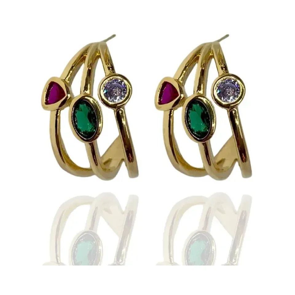 Brinco argola de tarraxa 3 aros e zircônias coloridas em forma geométrica