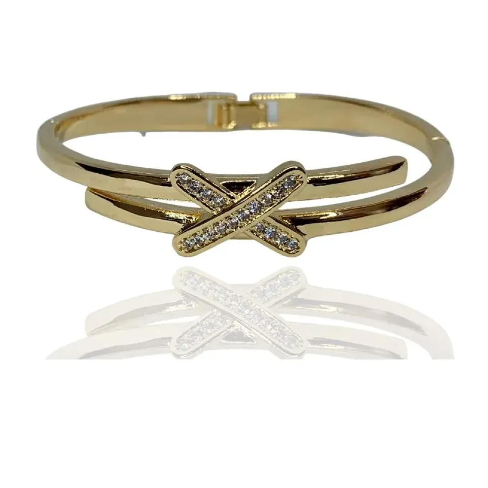 Bracelete aro com X cravejado com zircônias cristais na frente. Bracelete possue fecho.