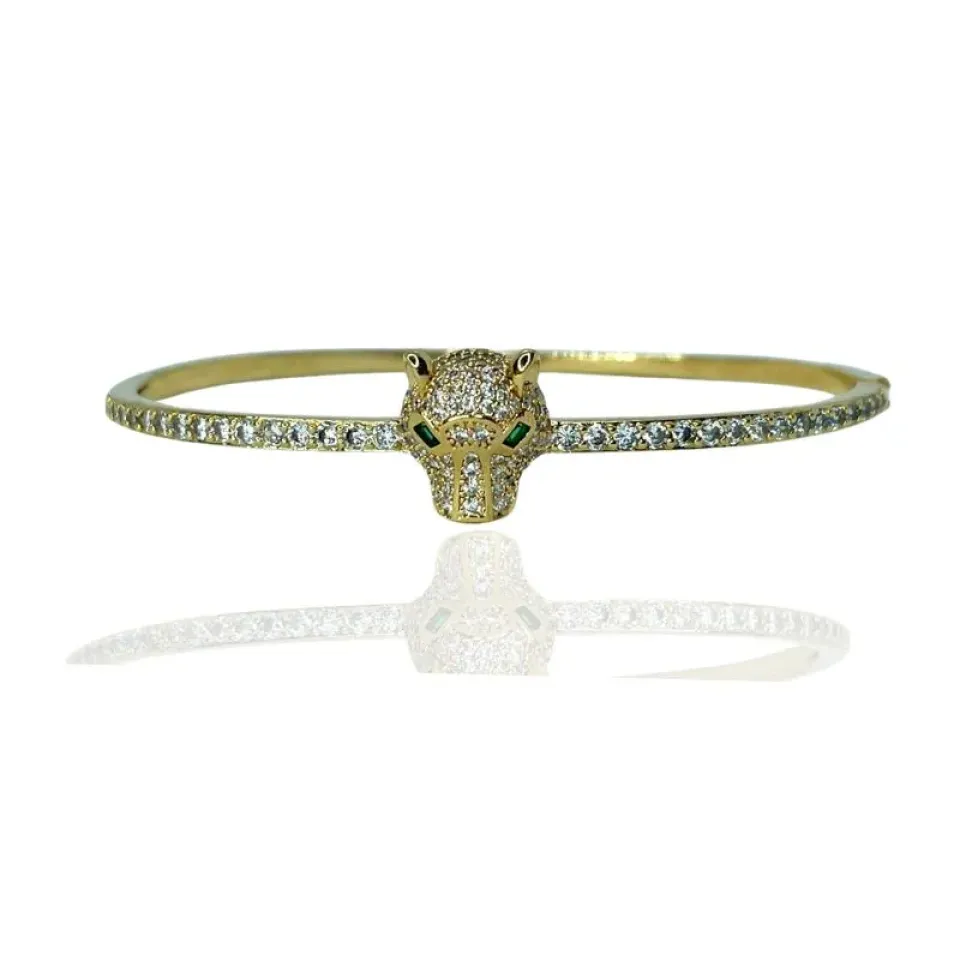 Bracelete fino cravejado com tigre cravejado olho baguete verde esmeralda