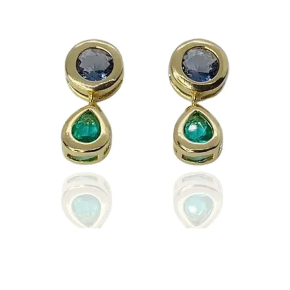 Brinco base redonda zircônia embutida lilás e pingente gota zircônia embutida verde