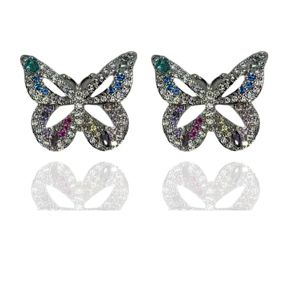 Brinco borboleta cravejada com zircônias coloridas e cristais e com baguetes nas pontas