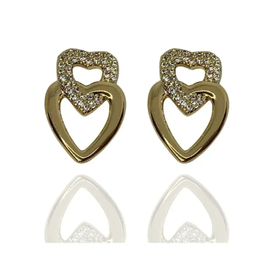 Brinco coração duplo liso e cravejado de zircônias cristais