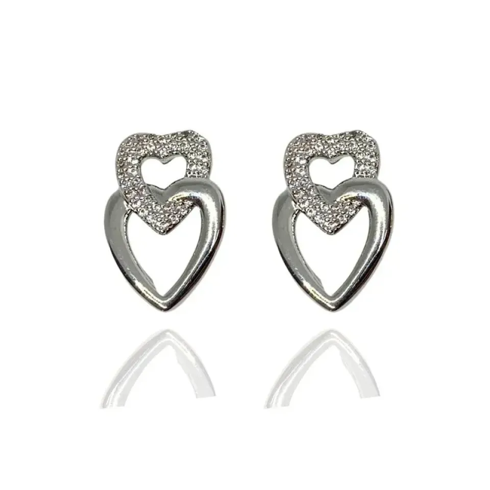 Brinco coração duplo liso e cravejado de zircônias cristais