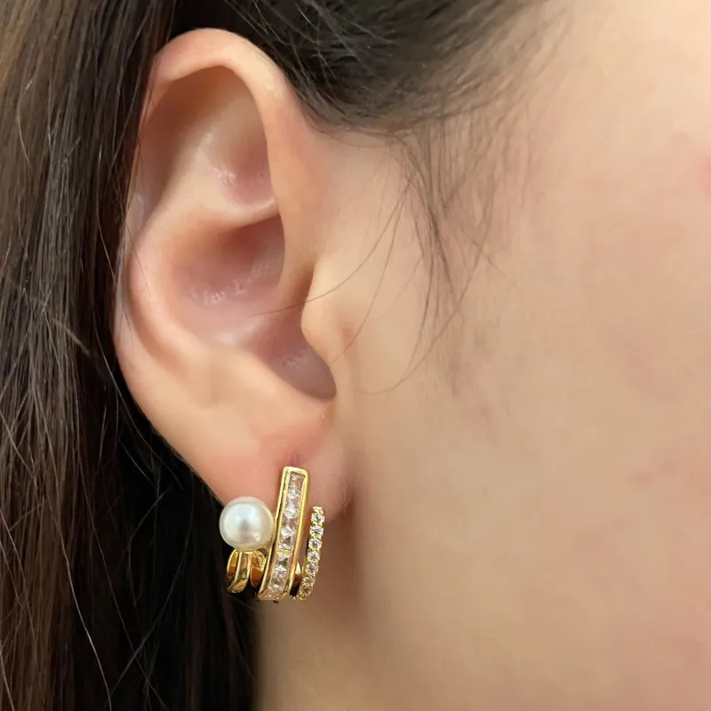 Brinco com 2 aros com cravação em zircônias cristais e 1 com uma pérola na ponta