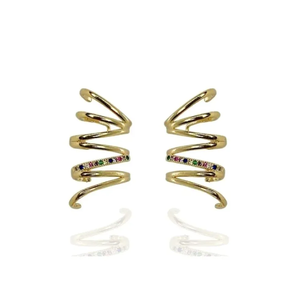 Brinco ear cuff aros lisos e 1 com cravação colorida