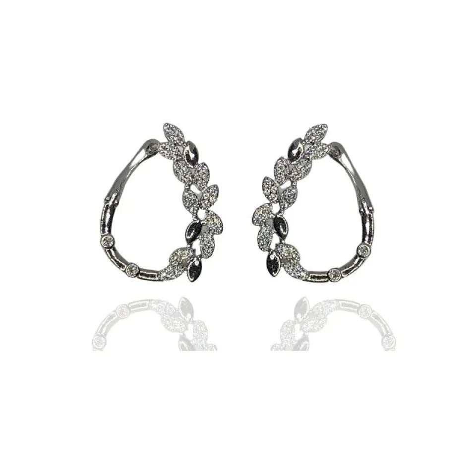 Brinco de encaixe diferente com folhas cravejadas de zircônias cristais