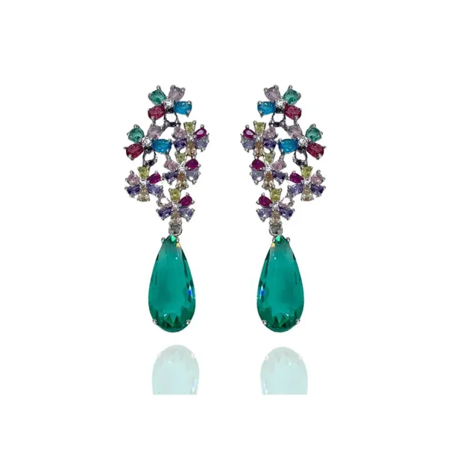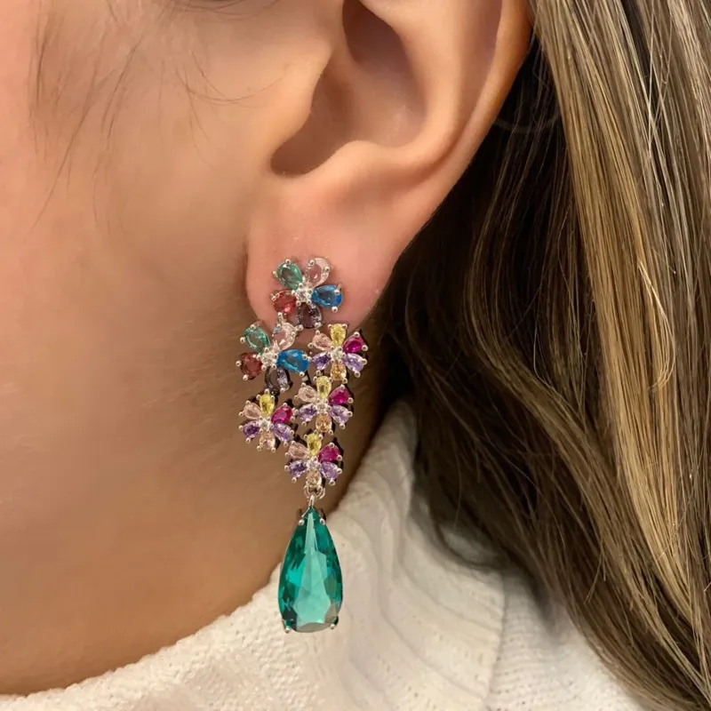 Brinco festa flores de zircônias coloridas e gota verde em zircônia