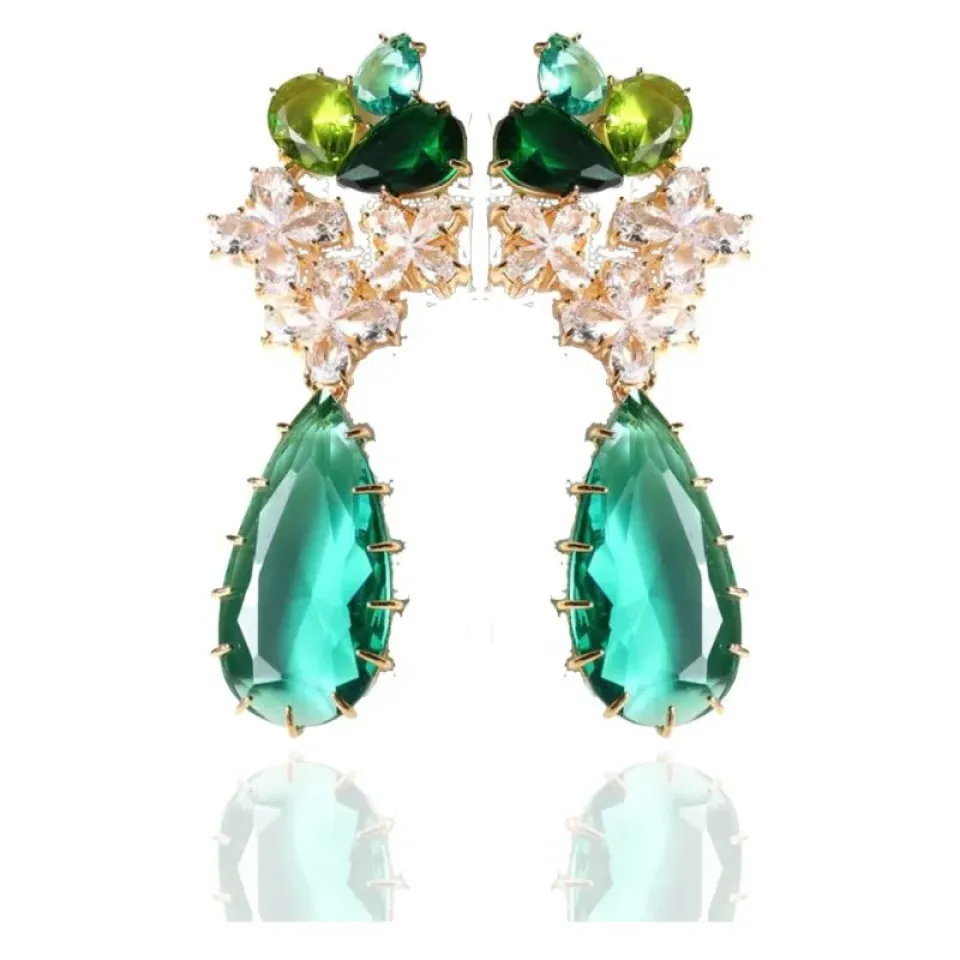 Brinco festa gotas verdes e flores cristais com gota grande verde pendurada