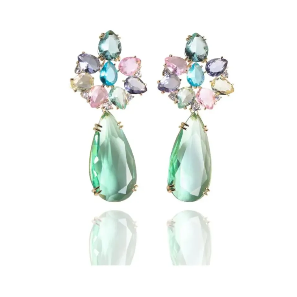 Brinco festa gotas coloridas e gota grande verde pendurada