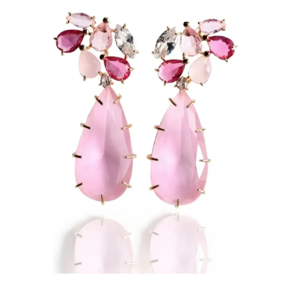 Brinco festa gotas rosa e fúcsia e navetes cristais e rosa, gota rosa pendurada
