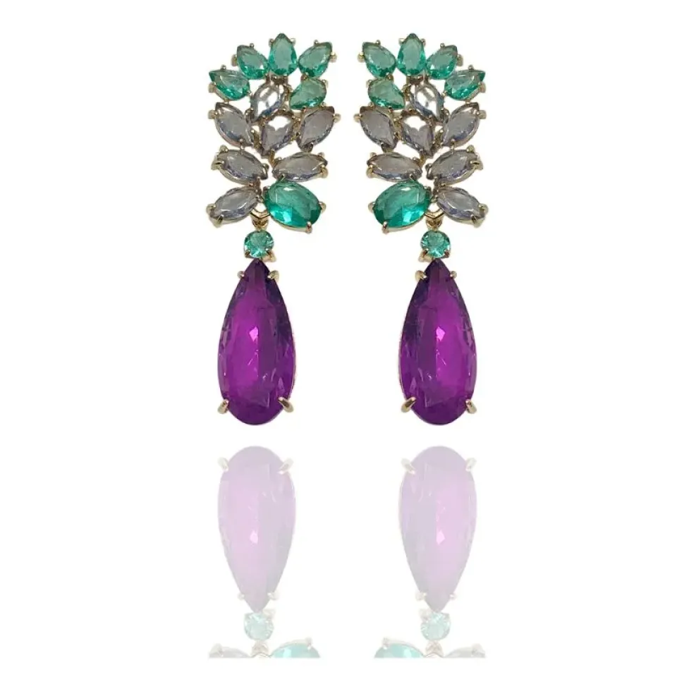 Brinco festa pedras navetes lilás, gotas verde e gota grande pendurada lilás