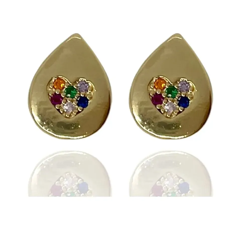 Brinco gota lisa com coração cravejado e zircônias coloridas