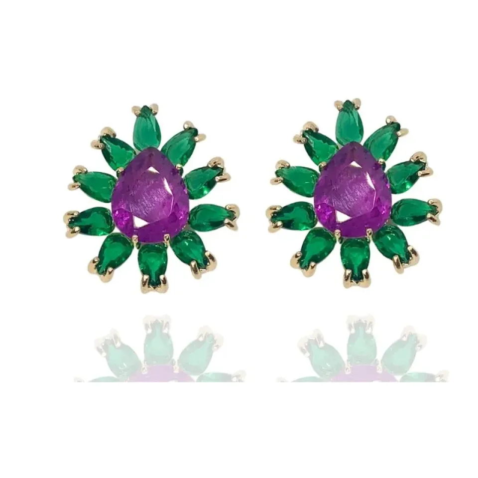 Brinco gota rosa grande e gotas verde esmeralda menores em volta