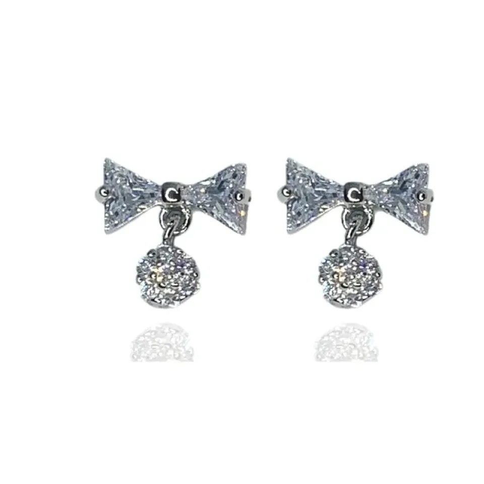 Brinco lacinho de zircônia cristal e flor cravejada pendurada