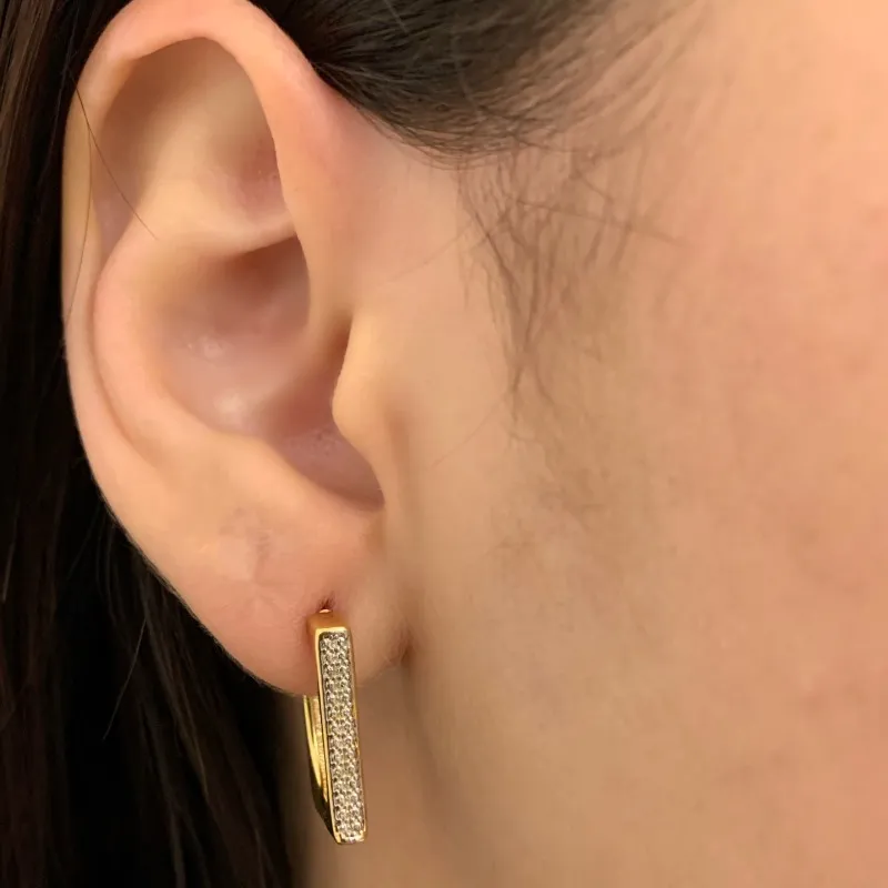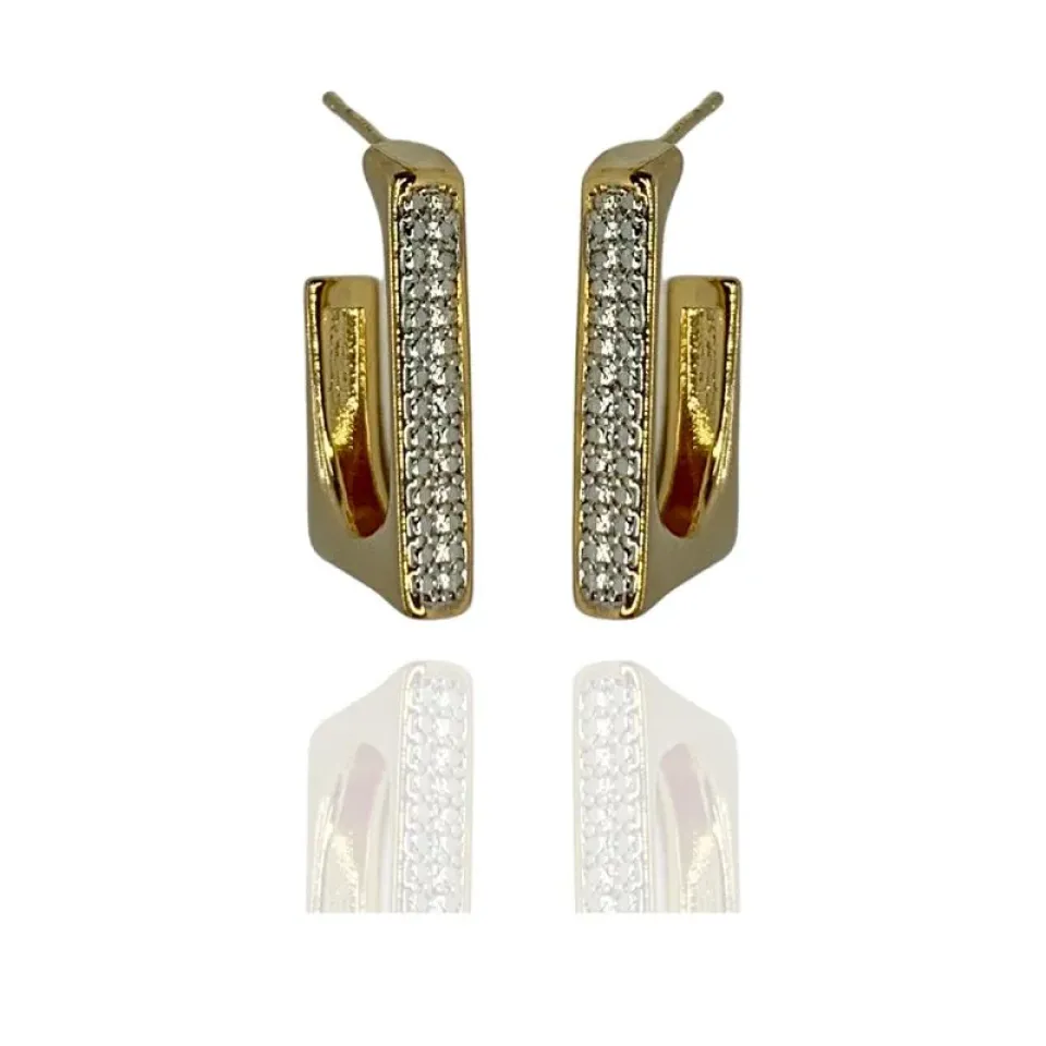 Brinco meia retangular argola de tarraxa com aplique de ródio branco na frente