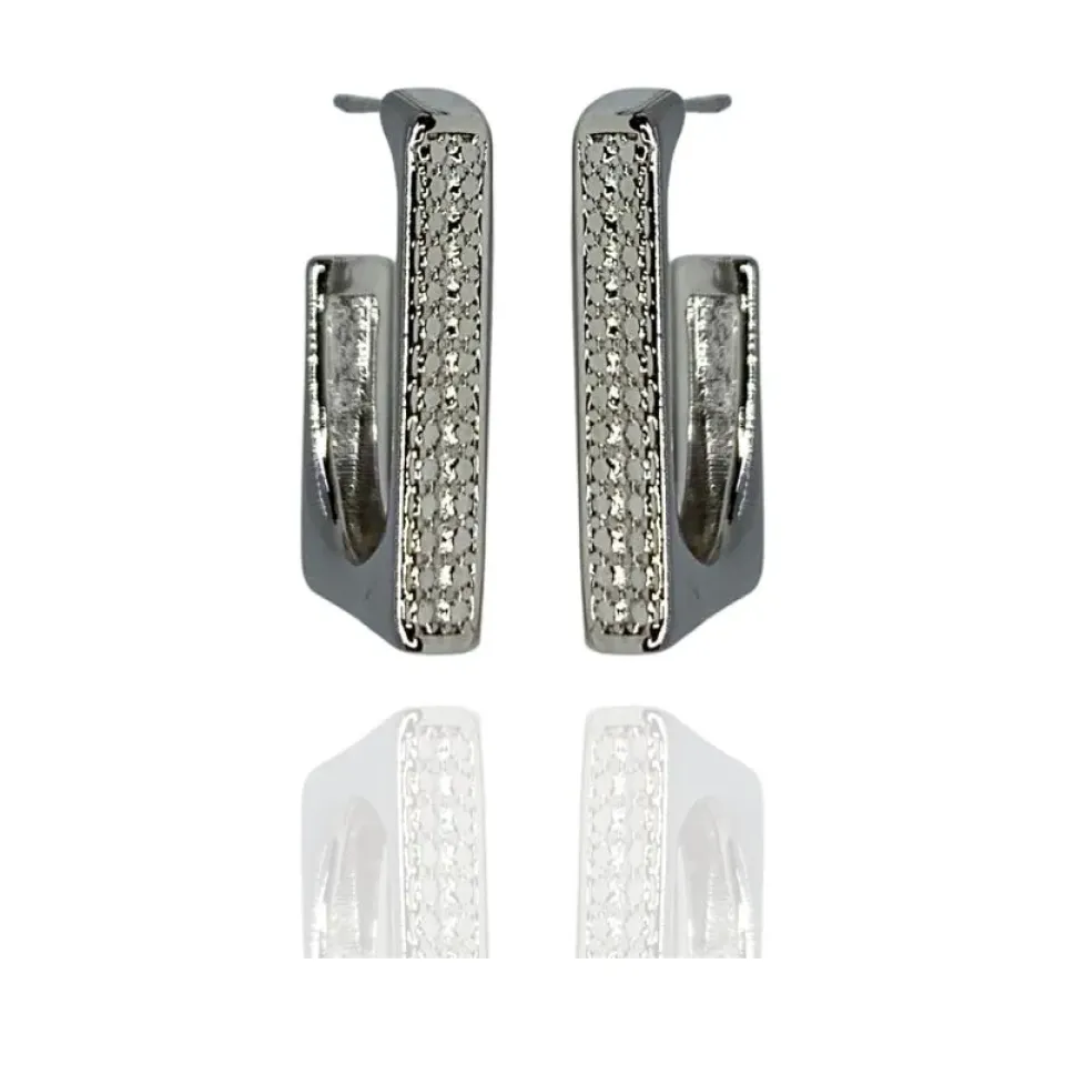 Brinco meia retangular argola de tarraxa com aplique de ródio branco na frente
