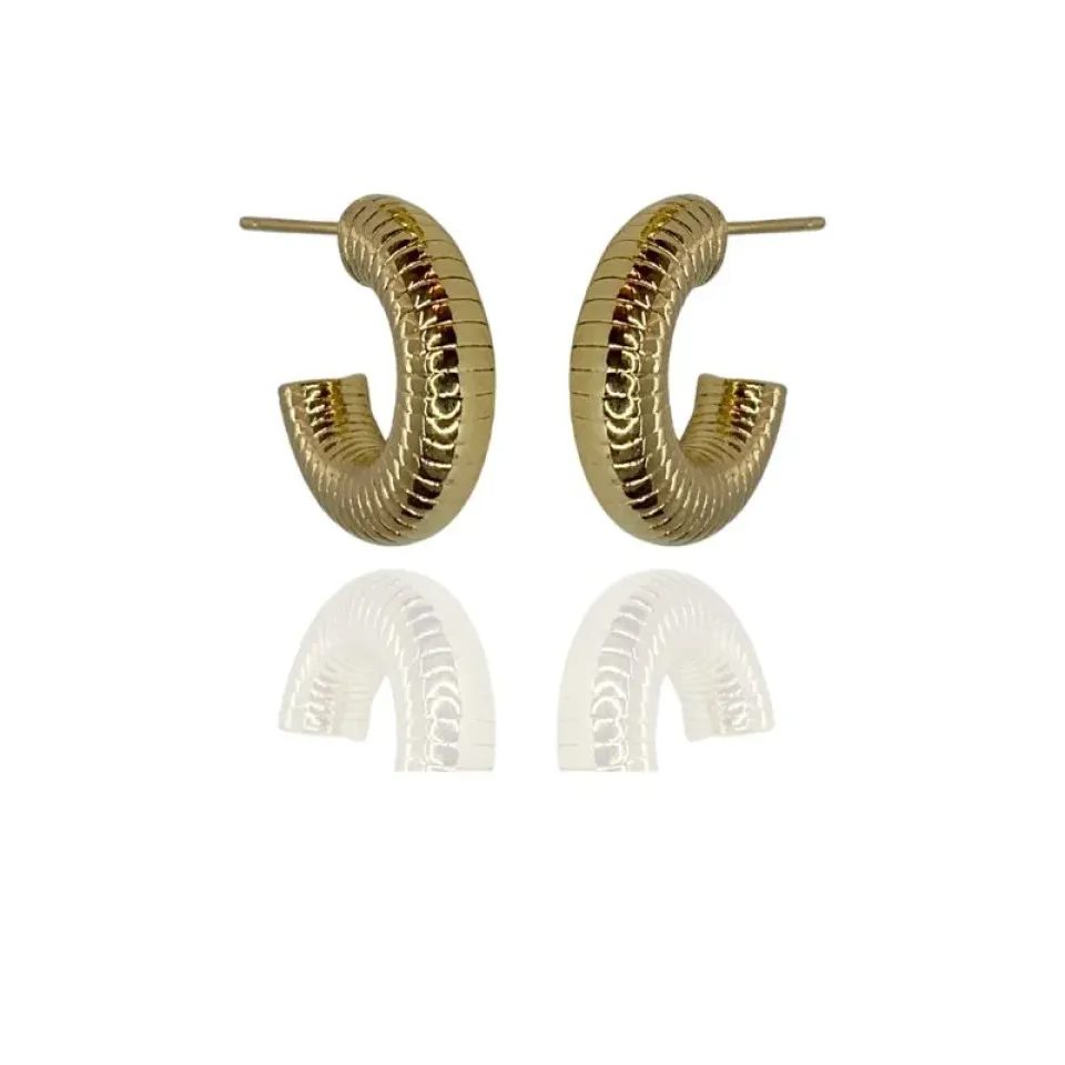 Brinco meia argola de tarraxa, tamanho pequena e toda trabalhada