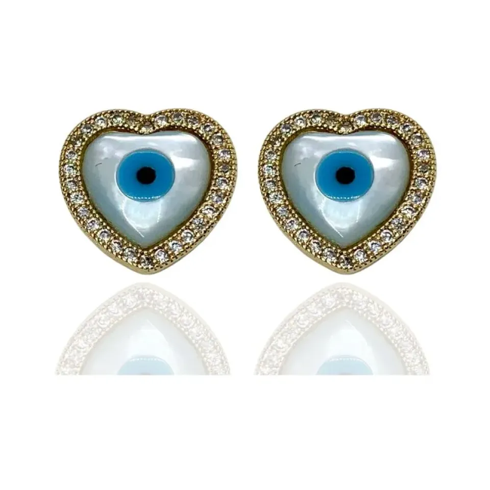 Brinco olho grego coração em madrepérola cravejado em volta