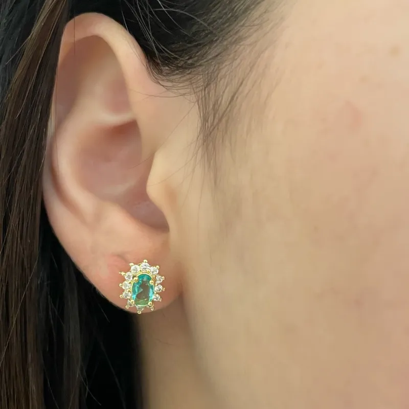 Brinco oval com zircônia verde claro no meio e zircônias cristais em volta
