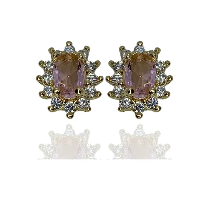 Brinco oval com zircônia rosê no meio e zircônias cristais em volta