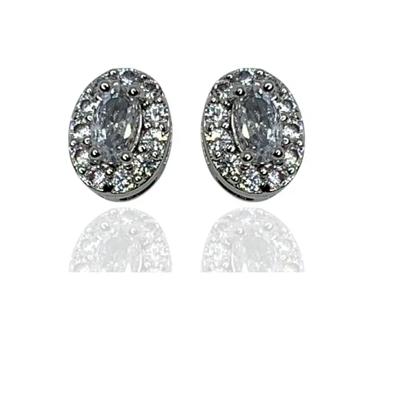 Brinco oval com zircônia cristal no meio e cravação cristal em volta