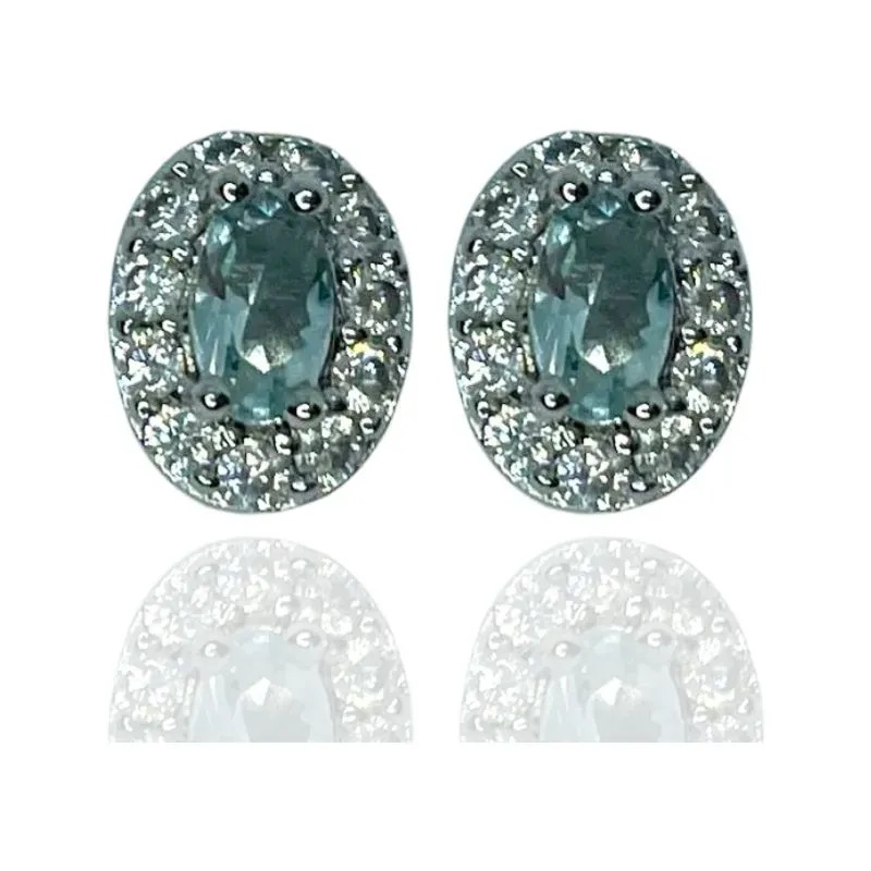 Brinco oval com zircônia azul aqua no meio e cravação cristal em volta