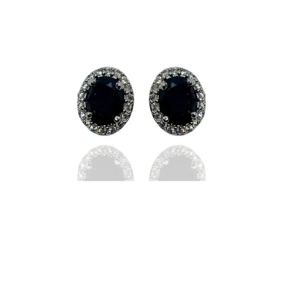 Brinco princesa com pedra oval preta no meio e cravejado com zircônias cristais em volta