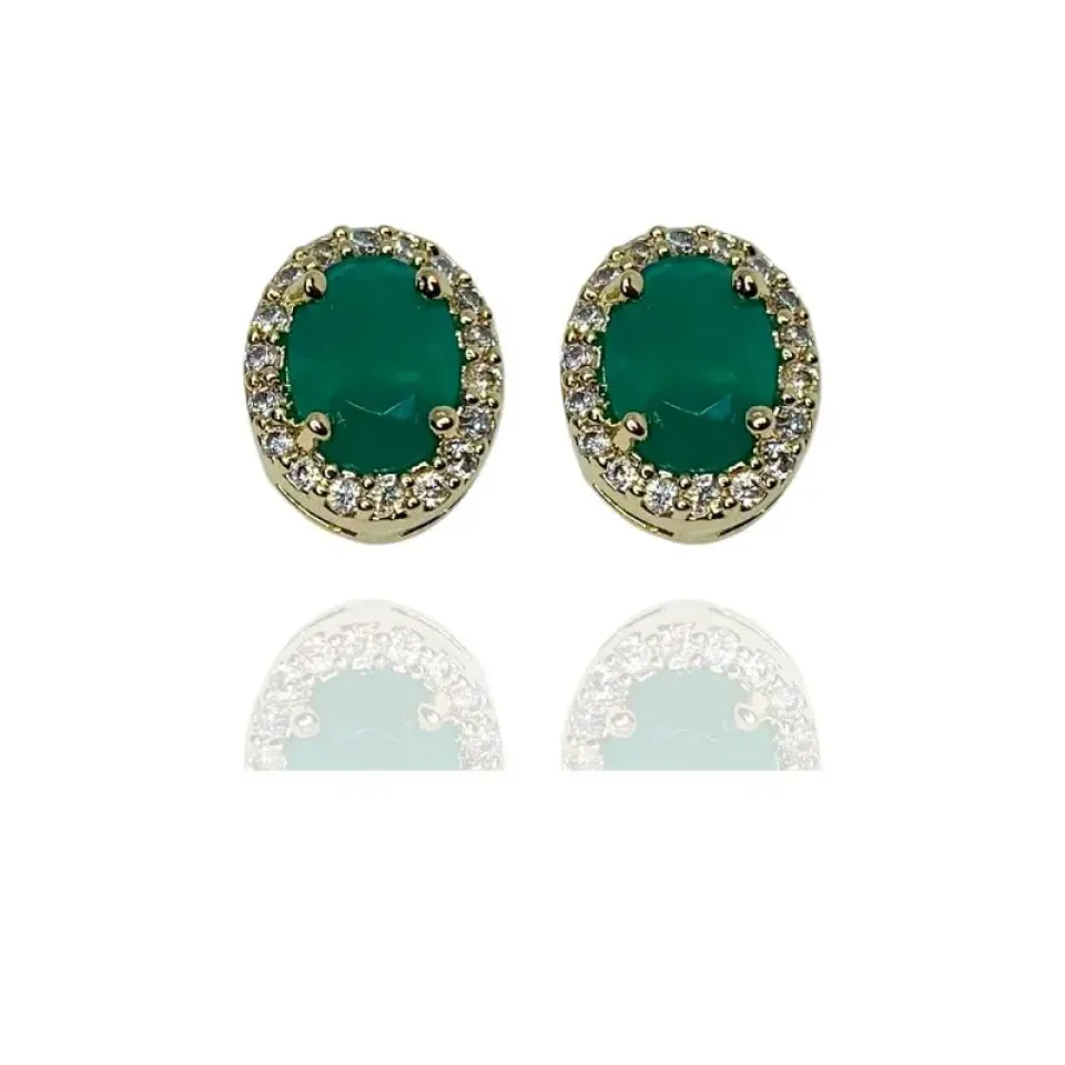Brinco princesa com pedra oval verde esmeralda no meio e cravejado com zircônias cristais em volta