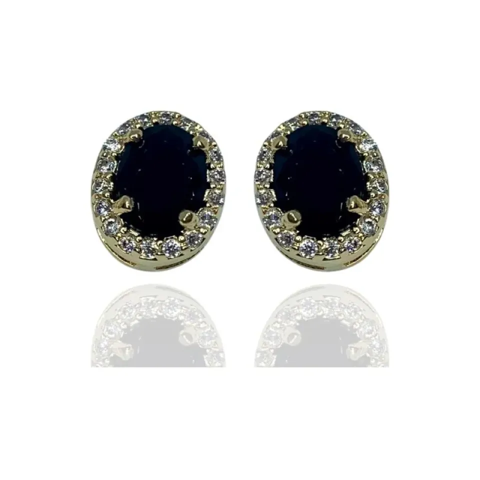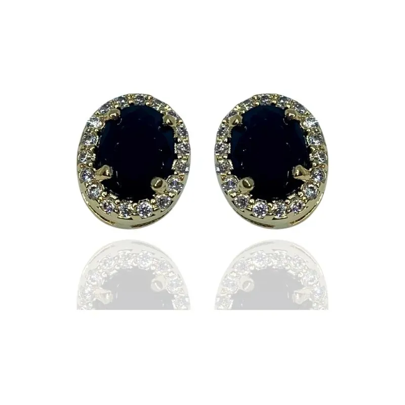 Brinco princesa com pedra oval preta no meio e cravejado com zircônias cristais em volta