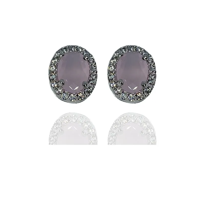 Brinco princesa com pedra oval rosa claro no meio e cravejado com zircônias cristais em volta