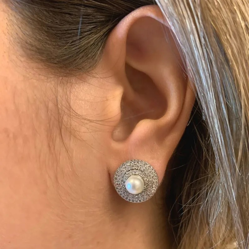 Brinco redondo cravejado com zircônias cristais e pérola no meio