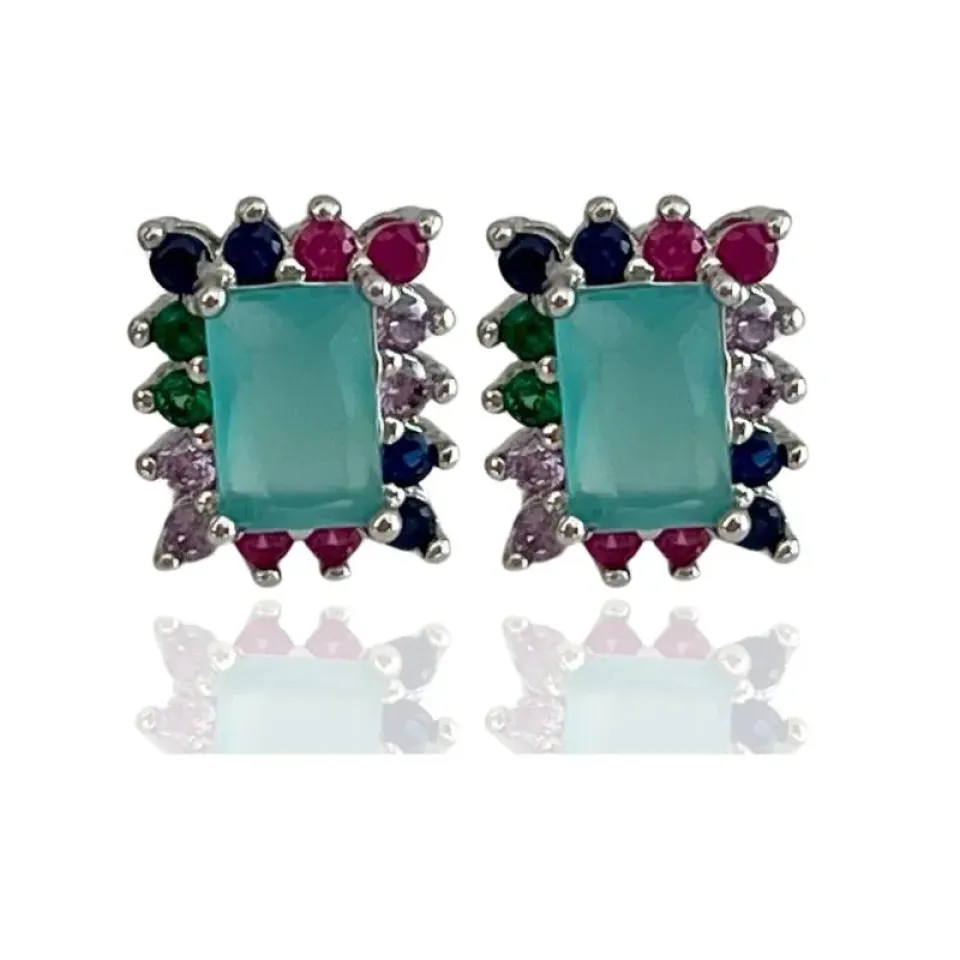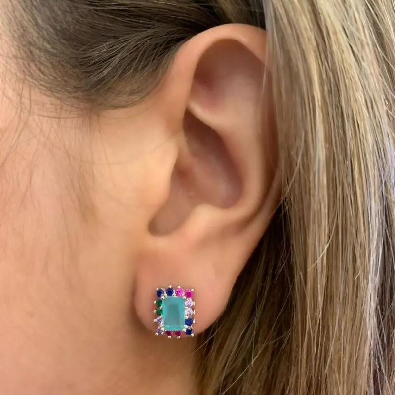 Brinco retangular pedra azul aqua e cravejado colorido em volta
