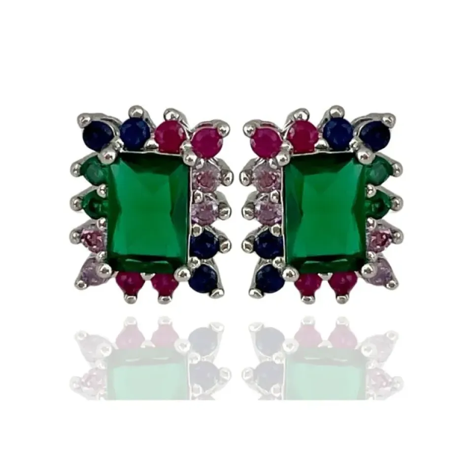 Brinco retangular pedra verde esmeralda e cravejado colorido em volta