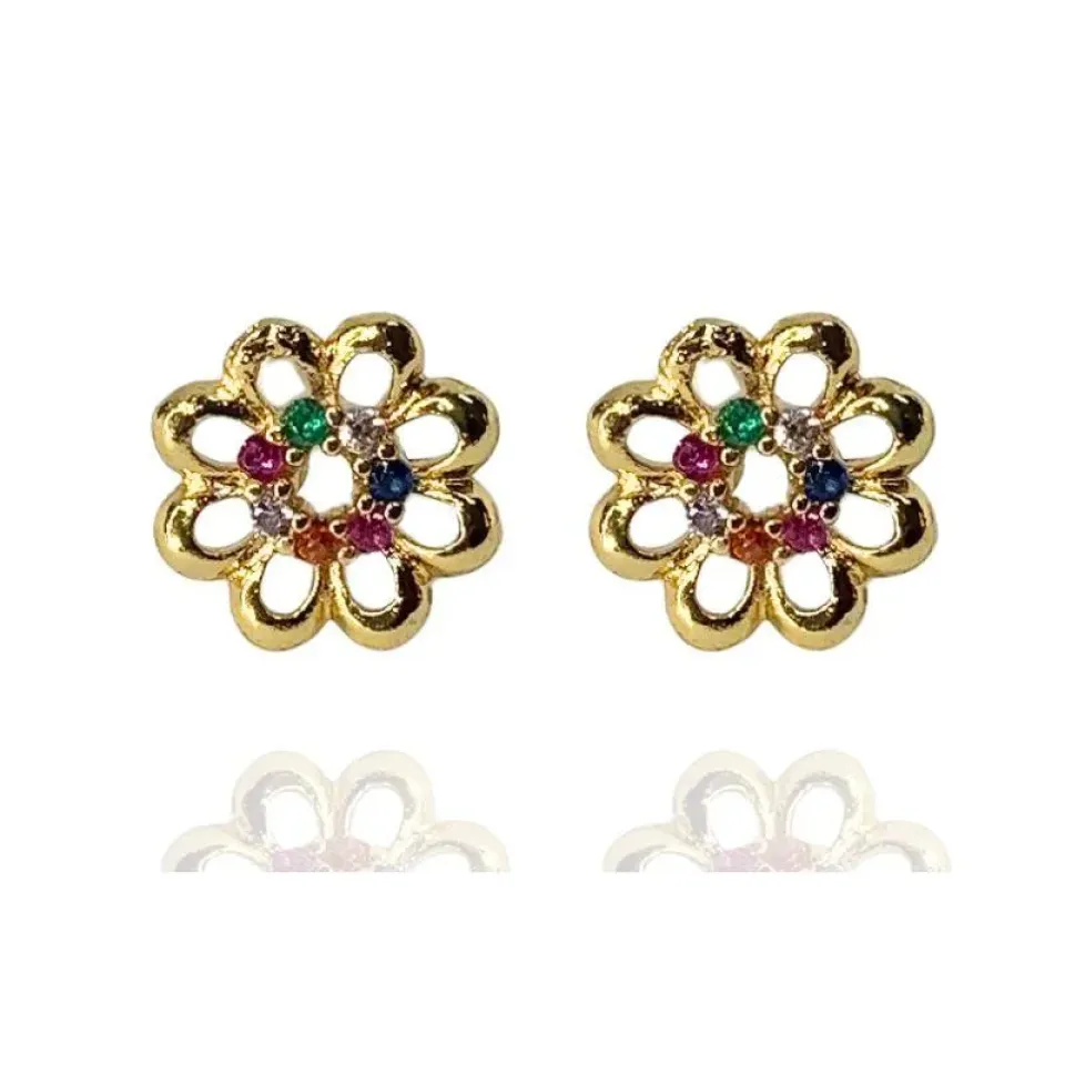 BRINCO SEGUNDO FURO FLOR PÉTALAS VAZADAS CRAVEJADO COLORIDO