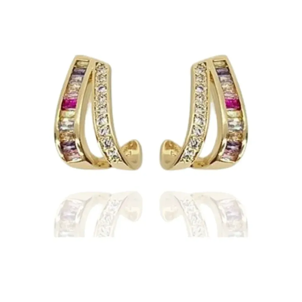 Brinco com cravação em zircônias cristais e zircônias coloridas em baguetes
