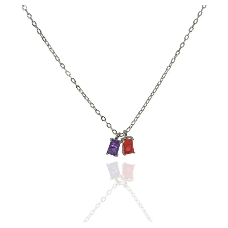 Choker corrente elos pequeno e 2 pingentes em zircônias fusion retangulares roxo e laranja