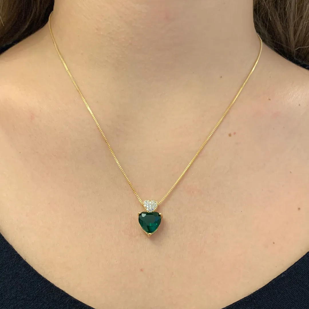 Colar com 2 corações cravejado e pedra verde esmeralda