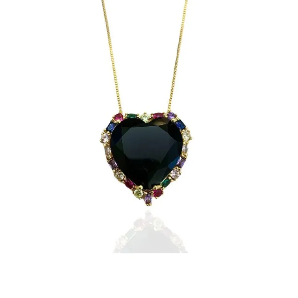 COLAR CORAÇÃO PEDRA GRANDE PRETA E COLORIDO EM VOLTA