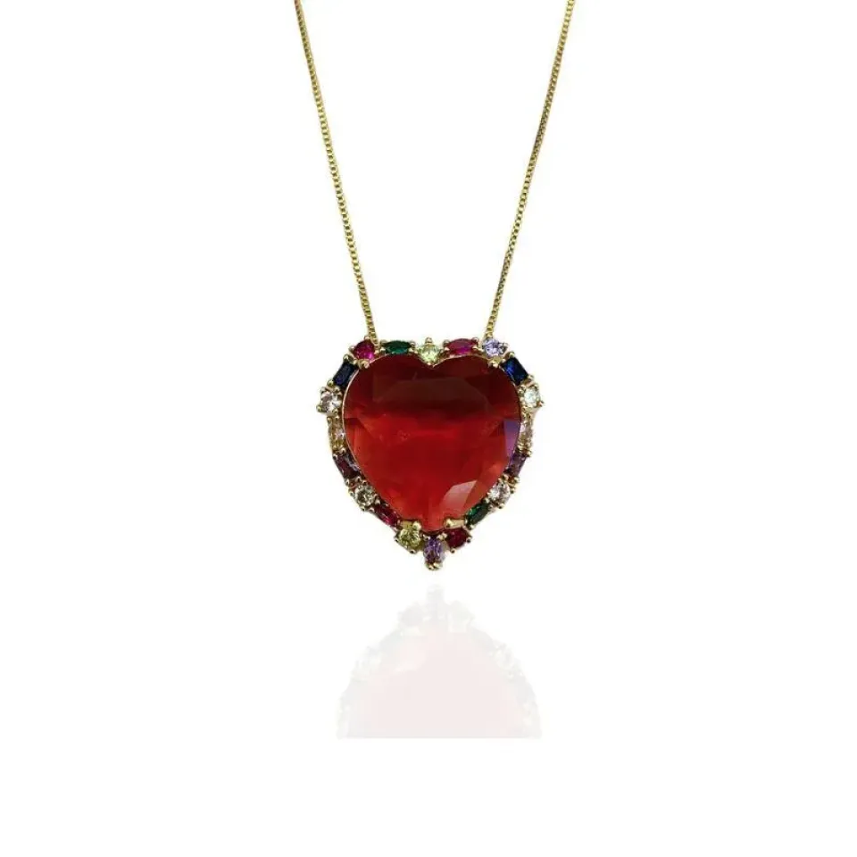 COLAR CORAÇÃO PEDRA GRANDE RUBI E COLORIDO EM VOLTA