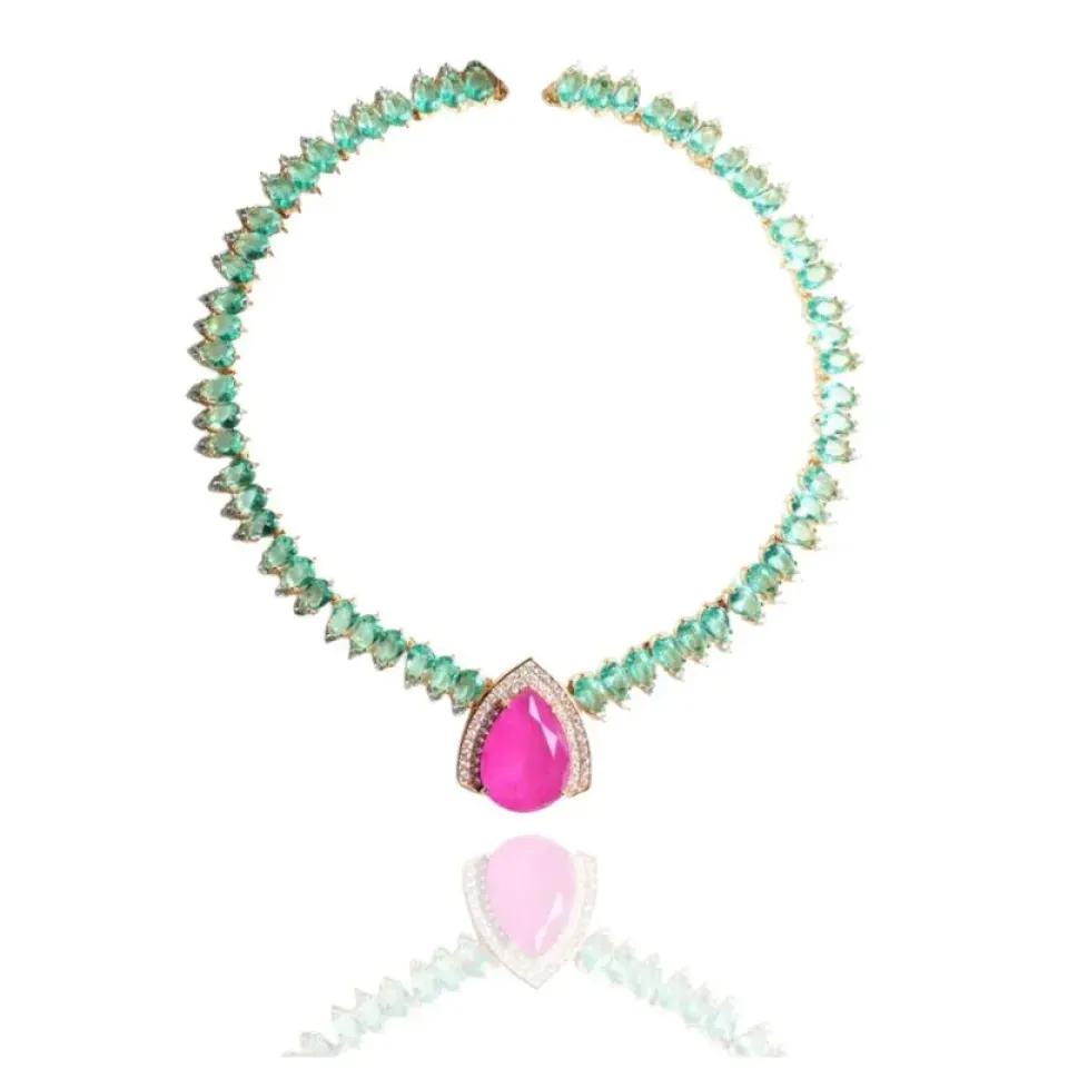 Colar festa gotas pequenas verdes com zircônias nas pontas e gota grande rosa fusion pink cravejada em volta
